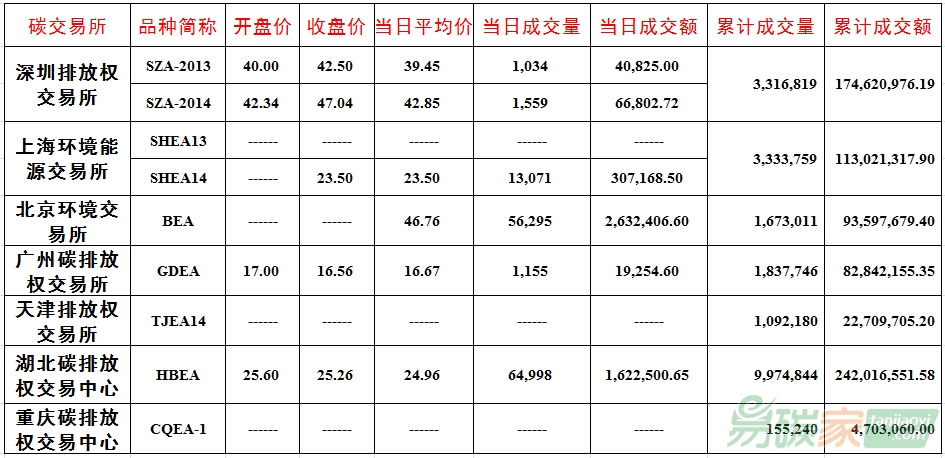 品種SZA-2013成交1,034噸,成交額40,825.90元,開盤價40.00元,最高價46.20元,最低價39.45元,收盤價42.50元,較前一交易日上漲1.19%。品種SZA-2014成交31,559噸,成交額1,066,802.72元,開盤價43.34元,最高價51.74元,最低價42.34元,收盤價47.04元,較前一交易日持平。截止當(dāng)日,深圳碳