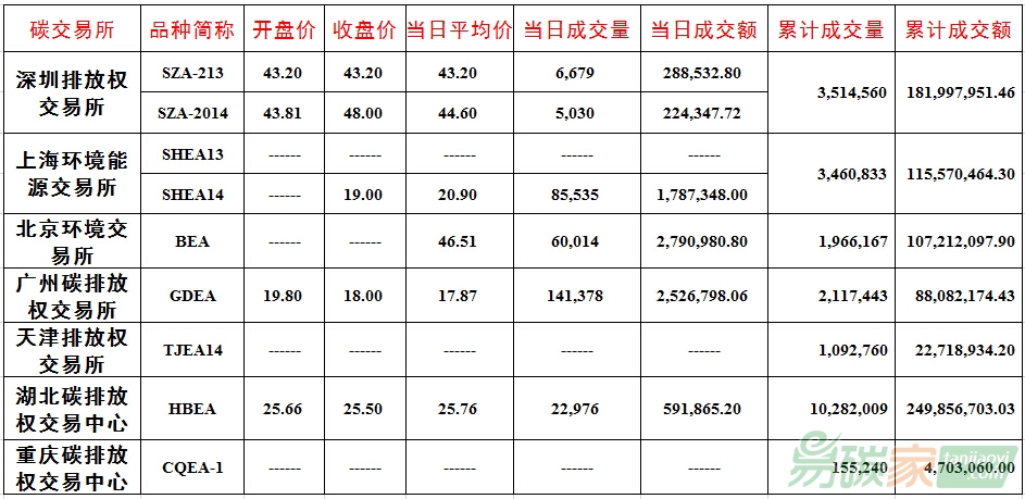 品種SZA-2013成交6,679噸,成交額288,532.80元,開盤價43.20元,最高價43.20元,最低價43.20元,收盤價43.20元,較前一交易日下跌10.00%。品種SZA-2014成交5,030噸,成交額224,347.72元,開盤價43.81元,最高價53.55元,最低價43.81元,收盤價48.00元,較前一交易日下跌1.40%。截止當日,深圳碳