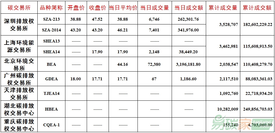 品種SZA-2013成交6,746噸,成交額262,301.76元,開盤價38.88元,最高價47.52元,最低價38.88元,收盤價47.52元,較前一交易日上漲10.00%。品種SZA-2014成交7,401噸,成交額341,976.00元,開盤價43.20元,最高價52.80元,最低價43.20元,收盤價43.20元,較前一交易日下跌10.00%。截止當(dāng)日,深圳碳