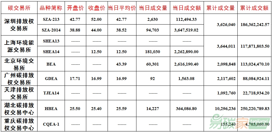 品種SZA-2013成交2,630噸,成交額112,494.33元,開盤價(jià)42.77元,最高價(jià)52.00元,最低價(jià)42.77元,收盤價(jià)52.00元,較前一交易日上漲9.43%。品種SZA-2014成交94,703噸,成交額3,647,519.02元,開盤價(jià)38.88元,最高價(jià)47.50元,最低價(jià)38.88元,收盤價(jià)44.00元,較前一交易日上漲1.85%。截止當(dāng)日,深圳碳