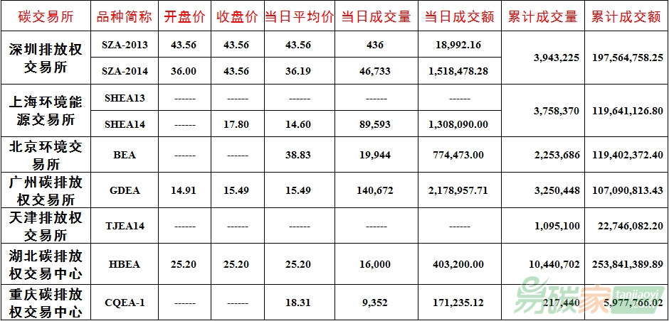 品種GDEA成交140,672噸,成交額2,178,957.71元,收盤價15.49元,較前一交易日上漲3.89%。截止當日,廣東碳市場配額總成交量3,250,448噸,總成交額107,090,813.43元。