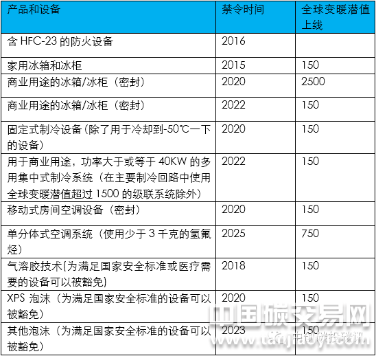 市場(chǎng)的HFCs 的數(shù)量和準(zhǔn)入條件,同時(shí)對(duì)于使用HFCs的新產(chǎn)品和設(shè)備給出了一個(gè)明確的禁令擴(kuò)展列表,詳見下表。