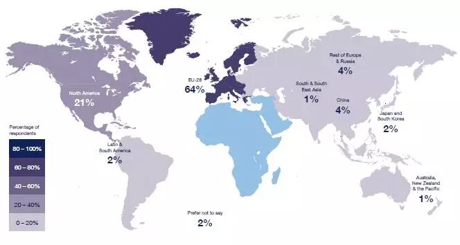 IETA(國(guó)際排放交易協(xié)會(huì))發(fā)布了第九版的《溫室氣體排放權(quán)交易市場(chǎng)信心調(diào)查報(bào)告》。今年的IETA調(diào)查反映了溫室氣體排放權(quán)交易市場(chǎng)的關(guān)鍵內(nèi)容,例如市場(chǎng)參與者對(duì)過(guò)去一年市場(chǎng)運(yùn)行情況的回顧,以及對(duì)未來(lái)價(jià)格和政策的預(yù)期。此次調(diào)查對(duì)象為IETA的成員,共收到來(lái)自不同地區(qū)和機(jī)構(gòu)的124份回復(fù)。這些機(jī)構(gòu)主要集中在歐洲和北美的碳市場(chǎng)(參見(jiàn)圖1、圖2)。