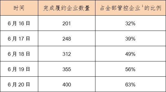 根據(jù)深圳排放權(quán)交易所公布的信息,截止到6月20日,深圳市已有400家管控企業(yè)通過注冊登記簿系統(tǒng)提交足額配額,完成履約義務(wù),約占全部管控企業(yè)的63%。企業(yè)履約進(jìn)展見下表: