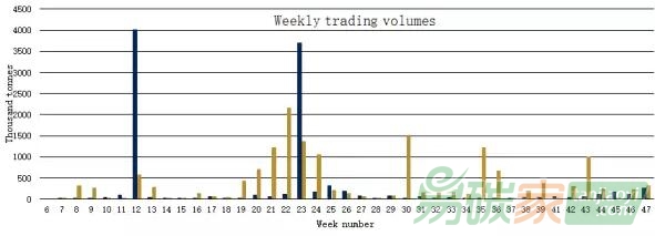 上周( 11月21日-11月25日)深圳市場上周日均交易量保持高位,總成交為26萬6千噸。廣東市場交易量本周繼續(xù)回升,但活躍度不高,交易集中在下午,價格總體呈穩(wěn)步上漲趨勢,本周交易量為32萬3千噸。價格方面,深圳市場上周周五收盤價為34.82,較前一周上漲了31.79%。廣東市場周五收盤價為11.21,較前一周上漲了5.75%。
