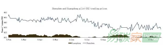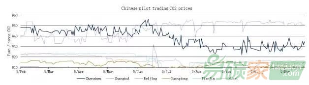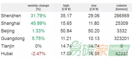 深圳收盤價較前一周上漲了31.79%,最高價35.17,最低價29.06,成交量為266569噸;上海試點交易均價上漲了45.99%,最高價15.65,最低價11.80,成交量為25309;北京交易均價較前一周上漲了1.33%,最高價為50.84,最低價為50.20,成交量為3332噸;廣東收盤價上漲了5,75%,最高價11.21,最低價10.13,成交量為323201噸;天津本周無成交;湖北市場收盤價較上周下跌了2.47%,最高價17.05,最低價16.55,成交量42332噸。