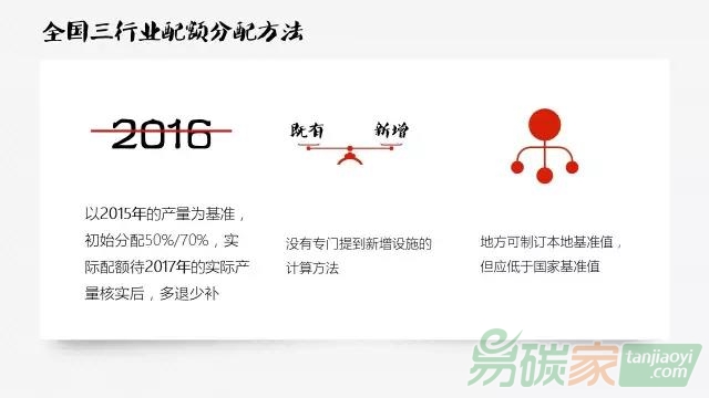 上述是三個(gè)行業(yè)的配額分配計(jì)算方法,均采用基準(zhǔn)法。在分配方式上,討論稿有如下特點(diǎn):