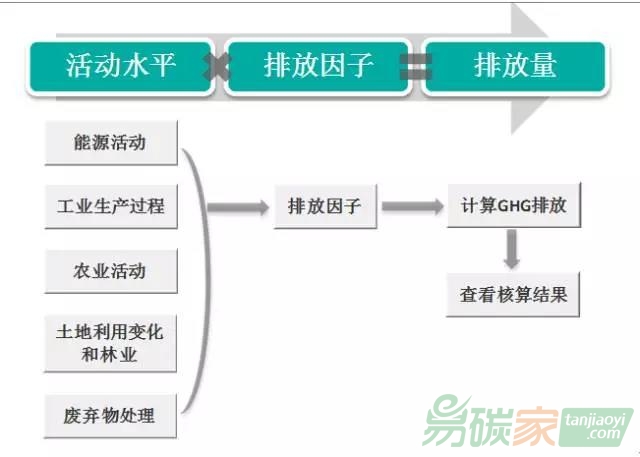 《省級清單指南》采用排放因子法,基本原理為:溫室氣體排放量等于活動水平(即逐級累加不同部門、不同設備和不同燃料品種的排放量)乘以排放因子計算原理。