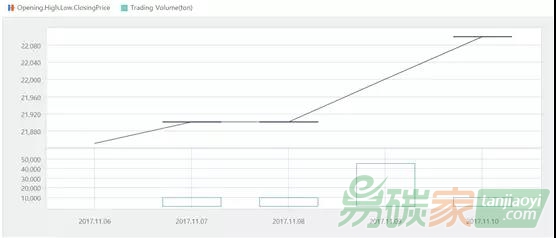 2017年11月6日至2017年11月12日,韓國(guó)碳市場(chǎng)價(jià)格在21850-22100韓元/噸之間(約19.54-19.76美元/噸)。