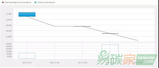 2017年11月27日至2017年12月3日,韓國(guó)碳市場(chǎng)價(jià)格在23500-25200韓元/噸之間(約21.62-23.18美元/噸)。
