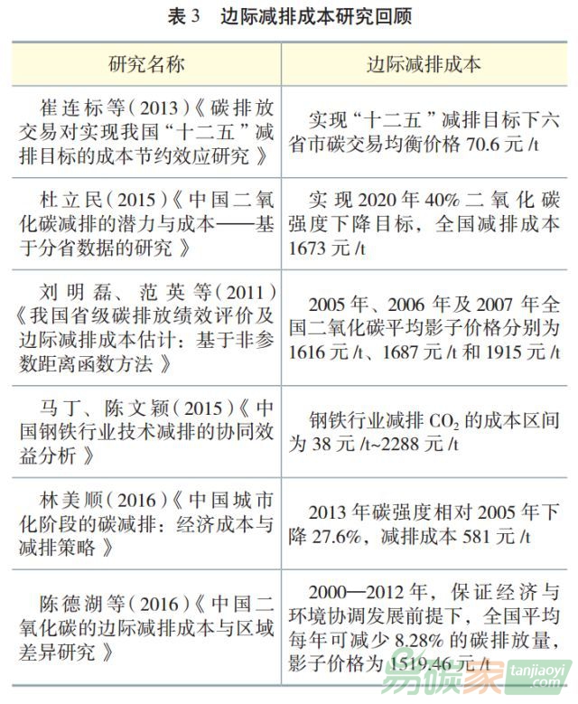 市場(chǎng)的推進(jìn),企業(yè)減排空間減小、減排成本提高,碳價(jià)格逐漸上升。根據(jù)近年國內(nèi)減排成本研究結(jié)果可以看出,不同減排目標(biāo)和模型方法計(jì)算全國、地區(qū)或行業(yè)的邊際減排成本區(qū)間為38元/t~2000元/t之間,最低區(qū)間與試點(diǎn)市場(chǎng)早期碳價(jià)接近,見表3??傮w來說,試點(diǎn)市場(chǎng)碳價(jià)格與邊際減排成本研究結(jié)果差距較大,碳價(jià)尚未反映社會(huì)減排成本。