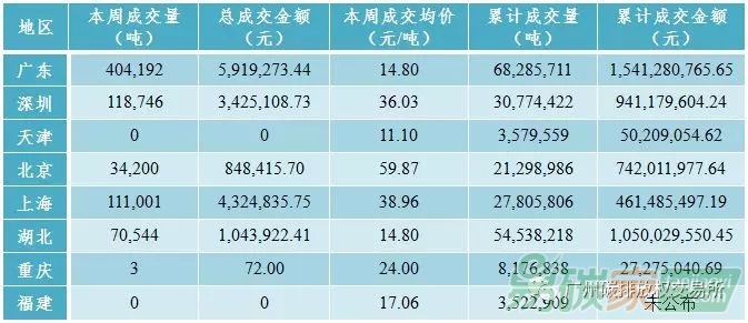 市場(chǎng)活躍度有所上升,共成交配額73.87萬(wàn)噸,較前一周上漲27.87%,總成交金額為1556.16萬(wàn)元,較前一周下跌9.69%。廣東