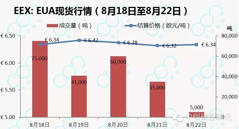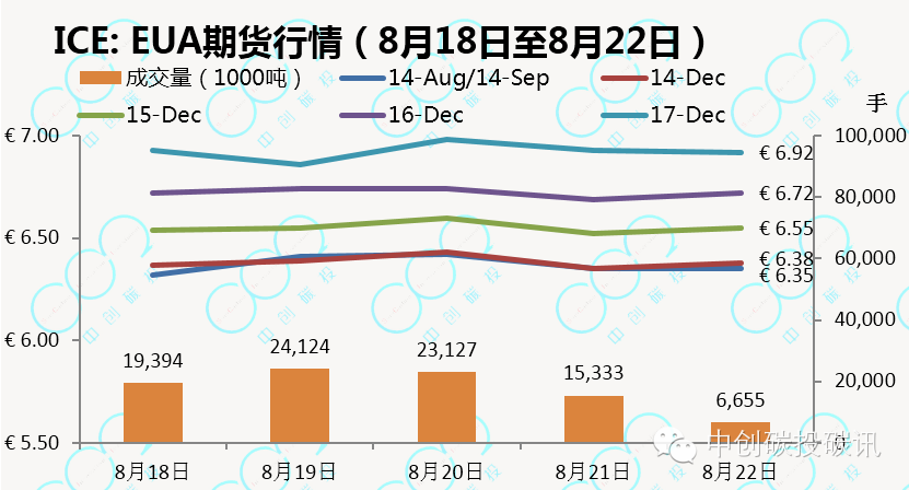 歐洲能源交易所(EEX)的EUA現(xiàn)貨價格周五結(jié)算價為6.34歐元/噸,比前一周五略下滑0.3%;周成交量為21.6萬噸,比前一周增加5萬噸。洲際交易所(ICE)的9月EUA期貨合約(Sep14 EUA)19日上市,周五結(jié)算價為6.35歐元;2014-2017年12月期貨合約周五結(jié)算價分別為6.38、6.55、6.72和6.92歐元,相比前一周均有上漲,漲幅0.6-1.7%不等。ICE的EUA月度期貨周成交88633手(8863.3萬噸),比前一周增加約一萬手。