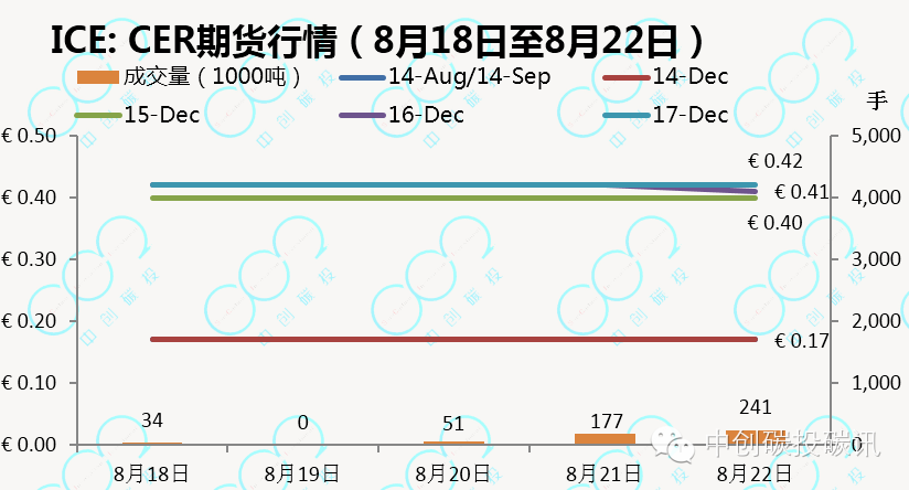上周,ICE的CER價格幾乎無波動,9月CER期貨合約(Sep14 CER)19日上市,周五收于0.17歐元,2014年12月CER期貨合約(Dec14 CER)同樣收于0.17歐元;2015-2017年12月CER期貨合約周五結(jié)算價分別為0.40、0.41和0.42歐元。CER期貨周成交503手(即50.3萬噸),比前一周增加110手。