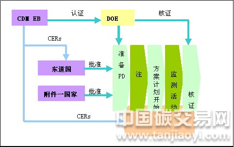 在項目最初的開發(fā)階段,需要掌握項目的整體情況,進入正式開發(fā)階段后需要編寫項目識別文件(PIN)、項目設(shè)計文件(PDD)。PIN主要是用來讓買方了解CDM項目基本信息與所產(chǎn)生的減排量信息,PDD里要詳細的說明項目的基本情況、減排量計算以及對環(huán)境的影響等,PIN和PDD都有聯(lián)合國制訂的專用格式文本。據(jù)易碳家了解到,PDD編寫完成后需要送交國家發(fā)展與改革委員會批準,待發(fā)改委批準后項目交給第三方認證機構(gòu)(DOE)對項目的真實性與合格性進行審核,經(jīng)DOE審定合格的項目最終將交給《聯(lián)合國氣候變化框架公約》清潔發(fā)展機制執(zhí)行理事會(EB)審核決定是否批準該項目為CDM項目。如果項目被EB批準,也就是成功注冊,該項目就被成功的開發(fā)為CDM項目。接下來,DOE會每隔一段時間(3月、半年、一年或者更長)對該項目所產(chǎn)生的溫室氣體減排量進行核證,并向EB提交核證報告申請簽發(fā)經(jīng)核證的減排量(CERs),隨后CERs便可出售給發(fā)達國家進行減排量交易,獲得出售CERs所得的額外資金。(見下圖示)
