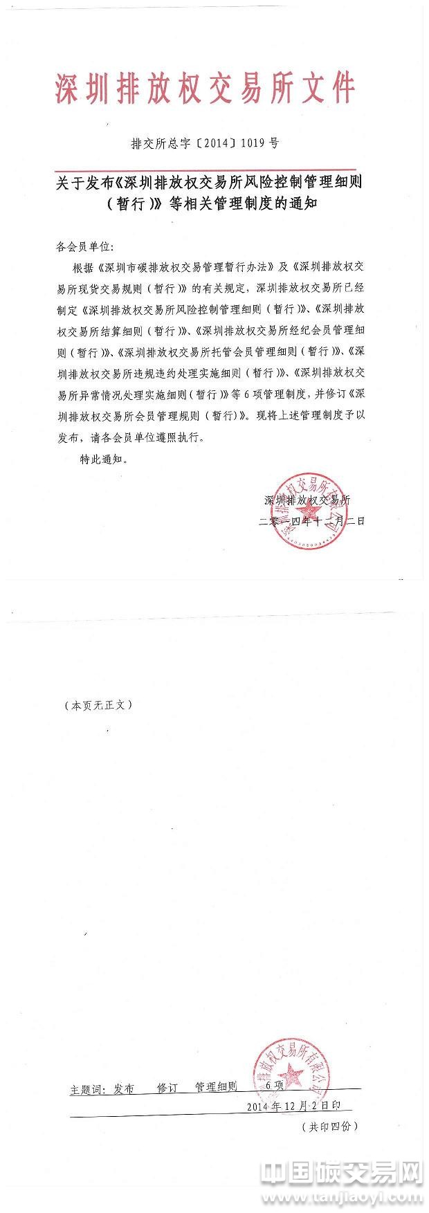 關于發(fā)布《深圳排放權交易所風險控制管理細則(暫行)》等相關管理制度的通知【排交所總字[2014]1019號】