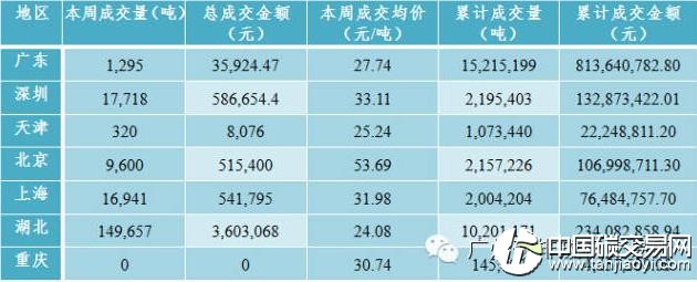 碳市場(chǎng)共成交配額19.55萬(wàn)噸,較前一周下跌42.43%,總成交金額為529.09萬(wàn)元,較前一周下跌48.80%。廣東碳市場(chǎng)上周成交量為1295噸,成交金額為35924.47元,周三收盤(pán)價(jià)為32.21元/噸,較前一周收盤(pán)價(jià)上漲9.71%。