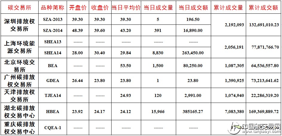 品種SZA-2013成交5噸,成交額196.50元,開盤價39.30元,最高價39.30元,最低價39.30元,收盤價39.30元,較前一交易日上漲8.92%。品種SZA-2014成交391噸,成交額16,890.00元,開盤價48.39元,最高價48.39元,最低價39.60元,收盤價39.60元,較前一交易日下跌10.00%。截止當(dāng)日,深圳碳市場配額總成交量2,192,093噸,總成交額132,691,010.23元。