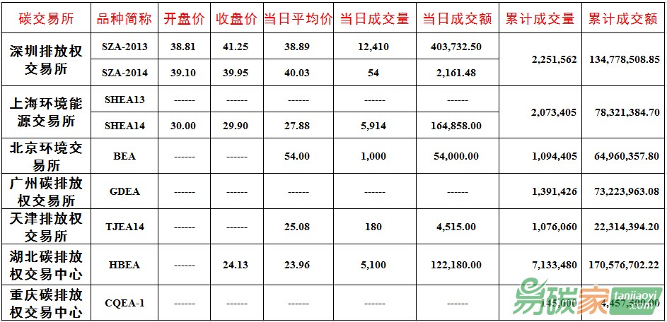 品種SZA-2013成交12,410噸,成交額403,732.50元,開盤價38.81元,最高價41.25元,最低價38.81元,收盤價41.25元,較前一交易日上漲10.00%。品種SZA-2014成交54噸,成交額2,161.48元,開盤價39.10元,最高價42.69元,最低價39.10元,收盤價39.95元,較前一交易日上漲2.94%。截止當(dāng)日,深圳碳