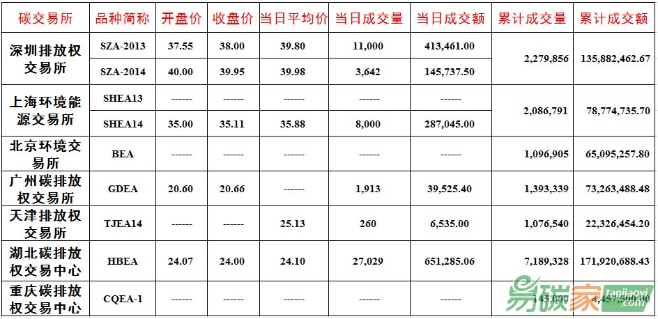 品種SZA-2013成交11,000噸,成交額413,461.00元,開盤價37.55元,最高價38.00元,最低價37.50元,收盤價38.00元,較前一交易日上漲0.00%。品種SZA-2014成交3,642噸,成交額145,737.50元,開盤價40.00元,最高價40.50元,最低價36.00元,收盤價39.95元,較前一交易日下跌0.12%。截止當日,深圳碳