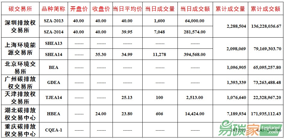 品種SZA-2013成交1,600噸,成交額64,000.00元,開盤價(jià)40.00元,最高價(jià)40.00元,最低價(jià)40.00元,收盤價(jià)40.00元,較前一交易日上漲5.26%。品種SZA-2014成交7,048噸,成交額281,574.00元,開盤價(jià)40.00元,最高價(jià)40.00元,最低價(jià)39.00元,收盤價(jià)40.00元,較前一交易日上漲0.13%。截止當(dāng)日,深圳碳