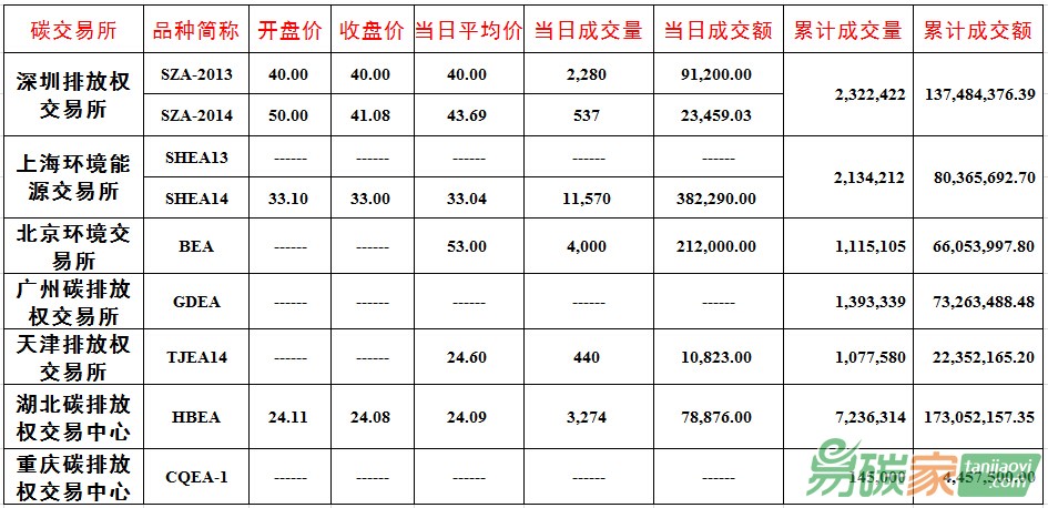品種SZA-2013成交2,280噸,成交額91,200.00元,開盤價(jià)40.00元,最高價(jià)40.00元,最低價(jià)40.00元,收盤價(jià)40.00元,較前一交易日上漲8.40%。品種SZA-2014成交537噸,成交額23,459.03元,開盤價(jià)50.00元,最高價(jià)50.00元,最低價(jià)41.08元,收盤價(jià)41.08元,較前一交易日下跌9.99%。截止當(dāng)日,深圳碳