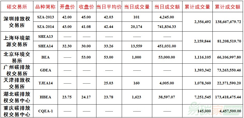 品種SZA-2013成交101噸,成交額4,245.00元,開盤價42.00元,最高價45.00元,最低價42.00元,收盤價45.00元,較前一交易日上漲8.43%。品種SZA-2014成交20,174噸,成交額741,834.33元,開盤價43.00元,最高價47.25元,最低價41.00元,收盤價41.08元,較前一交易日下跌4.35%。截止當(dāng)日,深圳碳