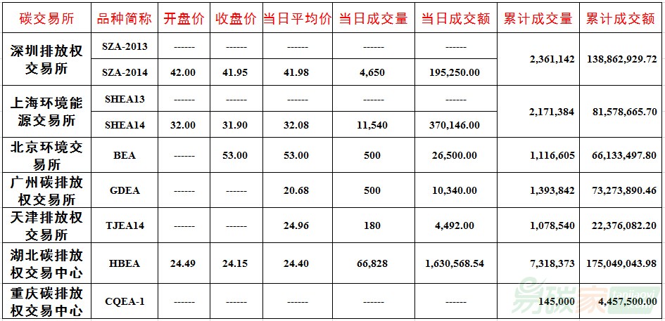 品種SZA-2014成交4,650噸,成交額195,250.00元,開盤價42.00元,最高價42.00元,最低價41.95元,收盤價41.95元,較前一交易日上漲2.12%。截止當日,深圳碳