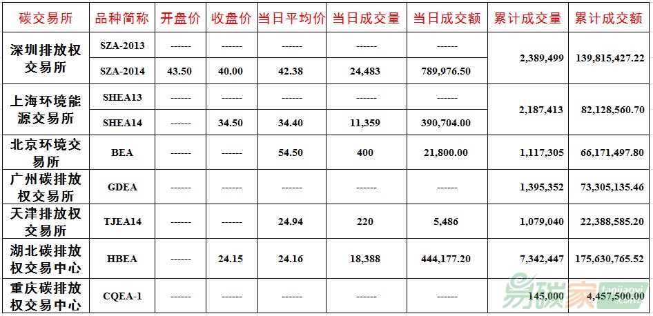 品種SZA-2014成交24,483噸,成交額789,976.50元,開盤價43.50元,最高價43.50元,最低價40.00元,收盤價40.00元,較前一交易日下跌4.76%。截止當(dāng)日,深圳碳