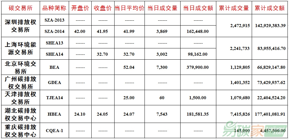 品種SZA-2014成交3,869噸,成交額162,448.00元,開盤價42.00元,最高價42.00元,最低價42.00元,收盤價41.95元,較前一交易日下跌0.12%。截止當日,深圳碳