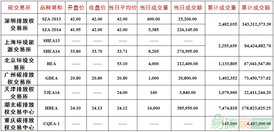 品種SZA-2013成交600噸,成交額25,200.00元,開(kāi)盤(pán)價(jià)42.00元,最高價(jià)42.00元,最低價(jià)42.00元,收盤(pán)價(jià)42.00元,較前一交易日上漲1.20%。品種SZA-2014成交5,385噸,成交額226,145.00元,開(kāi)盤(pán)價(jià)41.95元,最高價(jià)42.00元,最低價(jià)41.95元,收盤(pán)價(jià)42.00元,較前一交易日上漲0.00%。截止當(dāng)日,深圳碳