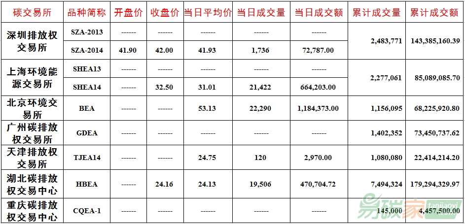 品種SZA-2014成交1,736噸,成交額72,787.00元,開盤價41.90元,最高價42.00元,最低價41.90元,收盤價42.00元,較前一交易日持平。截止當(dāng)日,深圳碳