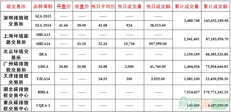 品種SZA-2014成交924噸,成交額38,513.60元,開盤價41.66元,最高價44.00元,最低價38.00元,收盤價38.00元,較前一交易日下跌8.43%。截止當(dāng)日,深圳碳