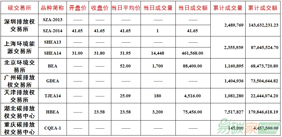 品種SHEA14成交14,448噸,成交額461,568.00元,收盤(pán)價(jià)31.80元,較前一交易日下跌1.24%。截止當(dāng)日,上海碳市場(chǎng)配額總成交量2,355,939噸,總成交額87,645,524.70元。