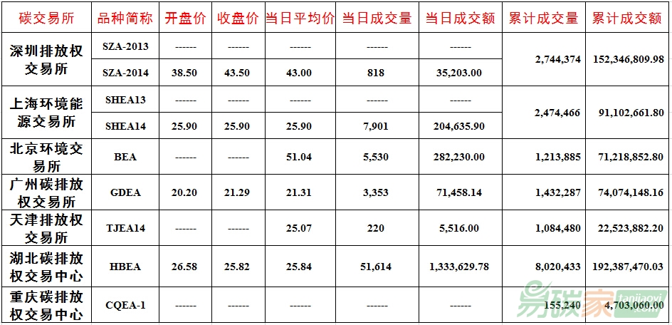 品種SZA-2014成交818噸,成交額35,203.00元,開盤價38.50元,最高價44.00元,最低價38.50元,收盤價43.50元,較前一交易日上漲4.82%。截止當(dāng)日,深圳碳