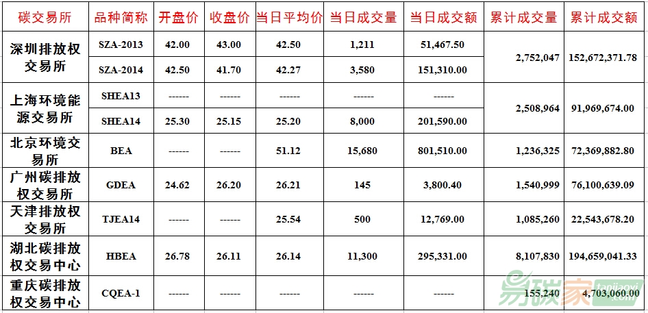 品種SZA-2013成交1,211噸,成交額51,467.50元,開盤價(jià)42.00元,最高價(jià)43.00元,最低價(jià)42.00元,收盤價(jià)43.00元,較前一交易日上漲2.38%。品種SZA-2014成交3,580噸,成交額151,310.00元,開盤價(jià)42.50元,最高價(jià)42.56元,最低價(jià)41.70元,收盤價(jià)41.70元,較前一交易日下跌2.14%。截止當(dāng)日,深圳碳