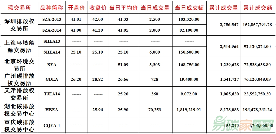 品種SZA-2013成交2,500噸,成交額103,320.00元,開盤價41.01元,最高價43.00元,最低價41.01元,收盤價42.00元,較前一交易日下跌2.33%。品種SZA-2014成交2,000噸,成交額82,100.00元,開盤價41.00元,最高價41.20元,最低價41.00元,收盤價41.20元,較前一交易日下跌1.20%。截止當(dāng)日,深圳碳