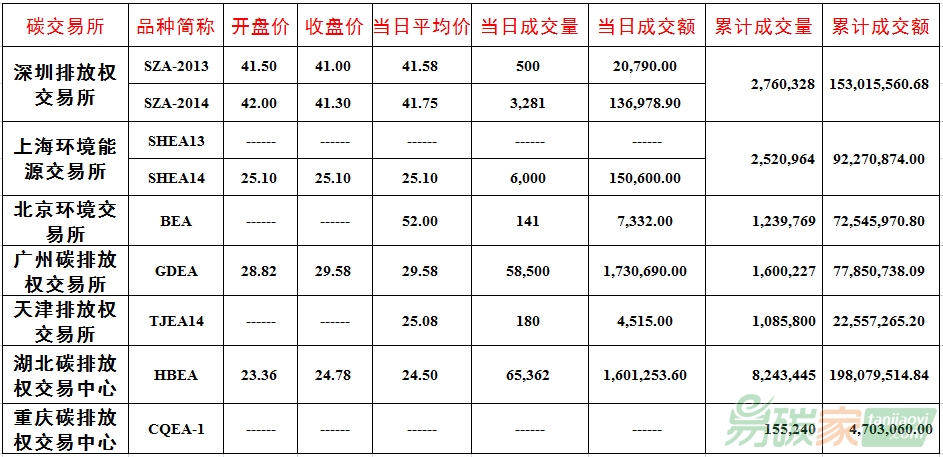 品種SZA-2013成交500噸,成交額20,790.00元,開盤價41.50元,最高價42.00元,最低價41.00元,收盤價41.00元,較前一交易日下跌2.38%。品種SZA-2014成交3,281噸,成交額136,978.90元,開盤價42.00元,最高價42.90元,最低價41.20元,收盤價41.30元,較前一交易日上漲0.24%。截止當日,深圳碳