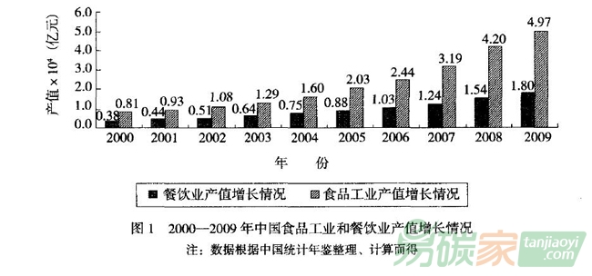 基于目前全球發(fā)展現(xiàn)狀,中國使用碳標(biāo)簽只是一個(gè)時(shí)間問題,而率先推廣食品碳標(biāo)簽則更為合適,主要涉及3個(gè)方面的原因:① 中國食品工業(yè)多年來始終保持持續(xù)增長,一直是全國第一大支柱性產(chǎn)業(yè)。2009年中國食品工業(yè)總產(chǎn)值達(dá)到4.97×104億元(圖1)。但中國食品工業(yè)現(xiàn)代化水平綜合指數(shù)不足40%,遠(yuǎn)低于世界先進(jìn)水平,且能源使用效率也不高,致使其單位產(chǎn)值碳排放量高于全球平均水平。②食品工業(yè)生產(chǎn)本身具有較高的碳排放,人類由于食品消費(fèi)所排放的溫室氣體約占全球溫室氣體總量的18%。另外,牲畜及其副產(chǎn)品的溫室氣體排放至少占全球總排放的51% ,遠(yuǎn)遠(yuǎn)超過聯(lián)合國糧農(nóng)組織(FAO)先前估計(jì)的18%的水平。然而,由于食品工業(yè)直接消耗的石化能源在整體工業(yè)中所占份額并不大,使得學(xué)者們對(duì)食品生產(chǎn)過程中的碳排放并未給予足夠的重視 ,這一情形在中國同樣如此。③ 同時(shí)中國擁有全球最大的食品消費(fèi)群體,碳標(biāo)簽食品的生產(chǎn)與推廣對(duì)引領(lǐng)低碳消費(fèi)更具普及面,且食品營養(yǎng)標(biāo)簽、有機(jī)食品標(biāo)簽等已逐步為中國消費(fèi)者所認(rèn)知。因此,以食品生產(chǎn)企業(yè)為案例研究碳標(biāo)簽食品生產(chǎn)的意愿將具有重要價(jià)值。
