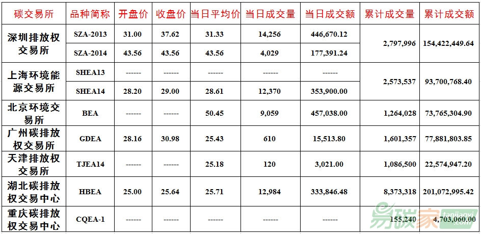 品種SZA-2013成交14,256噸,成交額446,670.12元,開盤價(jià)31.00元,最高價(jià)37.62元,最低價(jià)31.00元,收盤價(jià)37.62元,較前一交易日上漲10.00%。品種SZA-2014成交4,029噸,成交額177,391.24元,開盤價(jià)43.56元,最高價(jià)53.00元,最低價(jià)43.56元,收盤價(jià)43.56元,較前一交易日下跌10.00%。截止當(dāng)日,深圳碳