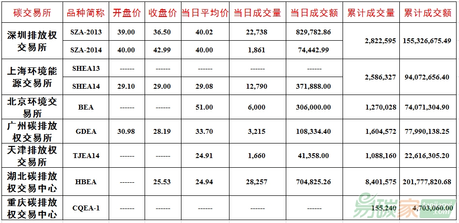 品種SZA-2013成交22,738噸,成交額829,782.86元,開盤價39.00元,最高價41.00元,最低價33.86元,收盤價36.50元,較前一交易日下跌2.98%。品種SZA-2014成交1,861噸,成交額74,442.99元,開盤價40.00元,最高價42.99元,最低價40.00元,收盤價42.99元,較前一交易日下跌1.31%。截止當日,深圳碳