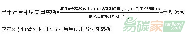 對(duì)可行性缺口補(bǔ)助模式的項(xiàng)目,在項(xiàng)目運(yùn)營(yíng)補(bǔ)貼期間,政府承擔(dān)部分直接付費(fèi)責(zé)任。政府每年直接付費(fèi)數(shù)額包括:社會(huì)資本方承擔(dān)的年均建設(shè)成本(折算成各年度現(xiàn)值)、年度運(yùn)營(yíng)成本和合理利潤(rùn),再減去每年使用者付費(fèi)的數(shù)額。計(jì)算公式為: