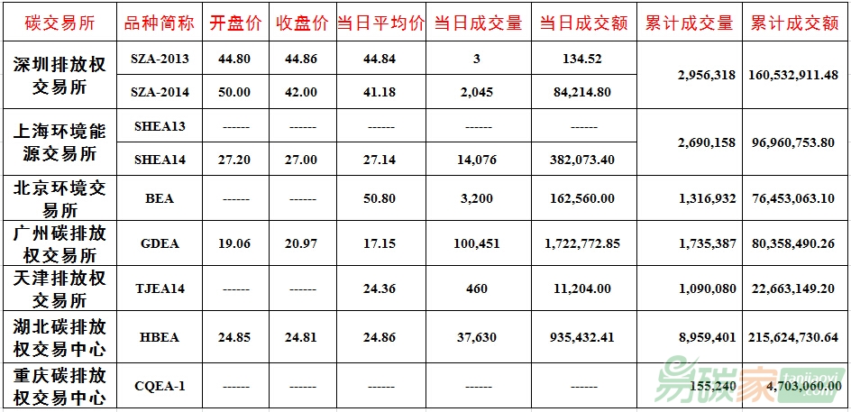 品種SZA-2013成交3噸,成交額134.52元,開盤價44.80元,最高價44.86元,最低價44.80元,收盤價44.86元,較前一交易日上漲10.00%。品種SZA-2014成交2,045噸,成交額84,214.80元,開盤價50.00元,最高價50.00元,最低價41.17元,收盤價42.00元,較前一交易日下跌-8.18%。截止當日,深圳碳