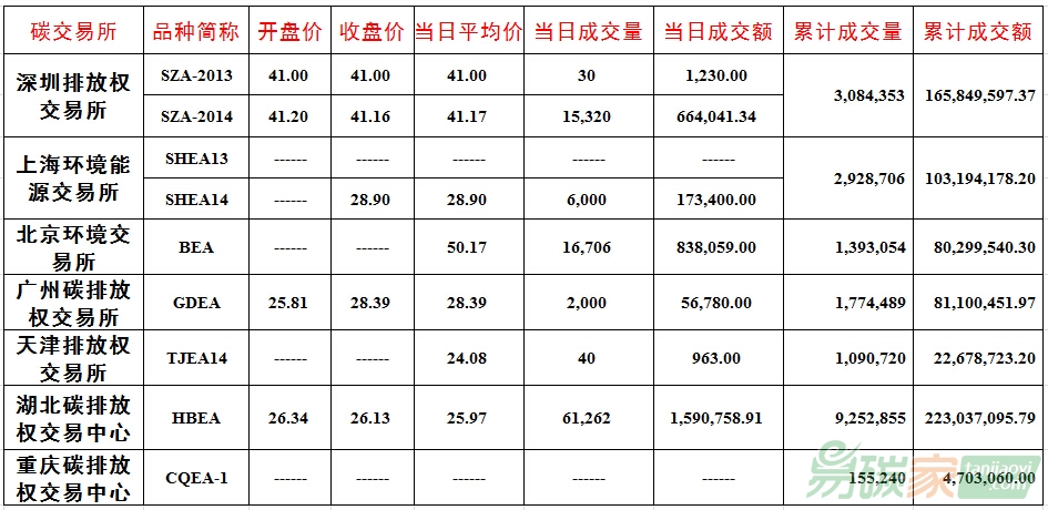 品種SZA-2013成交30噸,成交額1,230.00元,開盤價41.00元,最高價41.00元,最低價41.00元,收盤價41.00元,較前一交易日下跌8.89%。品種SZA-2014成交15,320噸,成交額664,041.34元,開盤價41.20元,最高價41.20元,最低價41.15元,收盤價41.16元,較前一交易日下跌9.97%。截止當日,深圳碳
