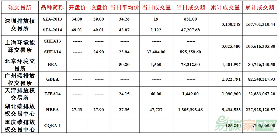 品種SZA-2013成交19噸,成交額651.00元,開盤價34.00元,最高價39.00元,最低價34.00元,收盤價39.00元,較前一交易日上漲5.41%。品種SZA-2014成交1,122噸,成交額47,207.68元,開盤價49.01元,最高價49.01元,最低價40.18元,收盤價49.01元,較前一交易日上漲10.01%。截止當日,深圳碳