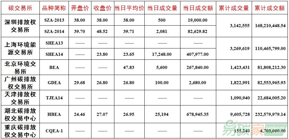 品種SZA-2013成交500噸,成交額19,000.00元,開盤價38.00元,最高價38.00元,最低價38.00元,收盤價38.00元,較前一交易日下跌5.00%。品種SZA-2014成交2,081噸,成交額82,629.82元,開盤價39.70元,最高價48.52元,最低價39.70元,收盤價48.52元,較前一交易日上漲10.00%。截止當日,深圳碳