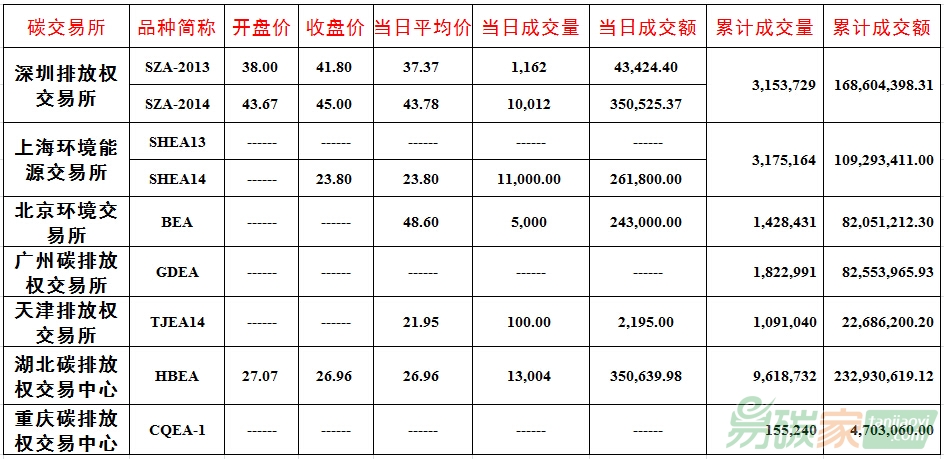 品種SZA-2013成交1,162噸,成交額43,424.40元,開盤價(jià)38.00元,最高價(jià)41.80元,最低價(jià)37.20元,收盤價(jià)41.80元,較前一交易日上漲10.00%。品種SZA-2014成交10,012噸,成交額350,525.37元,開盤價(jià)43.67元,最高價(jià)45.00元,最低價(jià)43.67元,收盤價(jià)45.00元,較前一交易日下跌7.25%。截止當(dāng)日,深圳碳