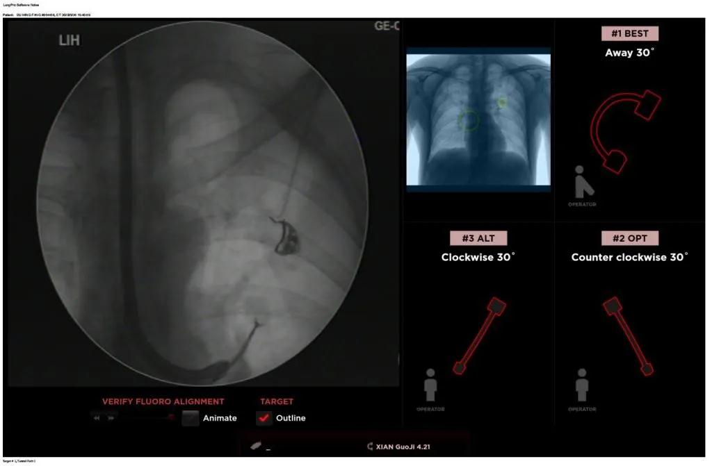 患者是一位59歲的男性,入院診斷左固有上葉前段肺小結(jié)節(jié),大小1.5cm*1.5cm。因?yàn)椴≡钆c支氣管不相通,無法開展經(jīng)支氣管自然腔道的活檢,而且病變距離胸壁較遠(yuǎn)、肋骨阻隔進(jìn)針線路、病灶周圍有血管包繞,如果進(jìn)行CT引導(dǎo)下經(jīng)皮肺穿刺活檢,則存在較大的氣胸、出血等并發(fā)癥的風(fēng)險(xiǎn)。