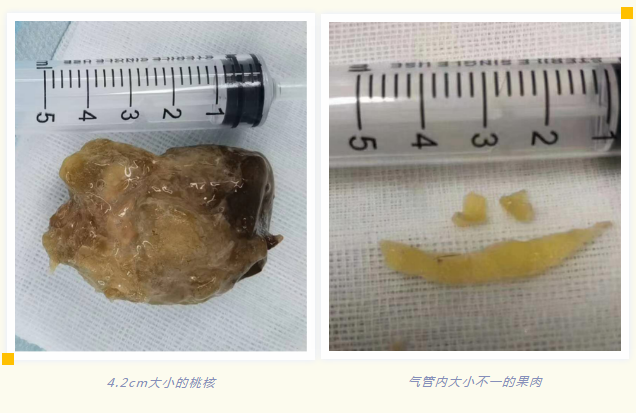 入院到治療結(jié)束,不到兩小時就取出4.2cm大小的桃核以及氣管內(nèi)大小不一的果肉。