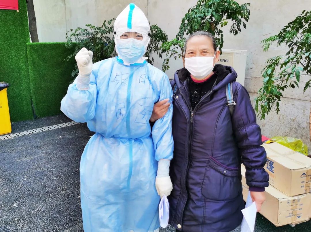 “阿姨你咋還不走呢?”護士長朱晴看到一位“熟人 ”還站在驛站門口。這位阿姨的老伴兒感染新冠不幸去世,她和兒子都被傳染,從醫(yī)院到康復(fù)驛站后出現(xiàn)了嚴重應(yīng)激反應(yīng),失眠,哭泣,休息不好,血壓升高,胃口很差。除了關(guān)注阿姨的身體狀況外,朱晴時常寬慰她,要保重身體和兒子一起回家。“我要和你留個照片,以后一定要去西安看你。當(dāng)面感謝你們醫(yī)療隊!”阿姨挽著朱晴的胳膊說。